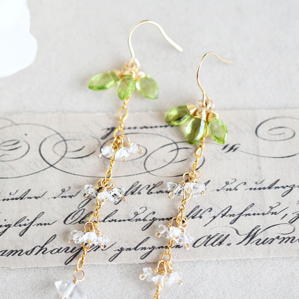 透明度が良く、高品質黄緑色のペリドット+ハーキマーダイヤモンドのピアスです。
