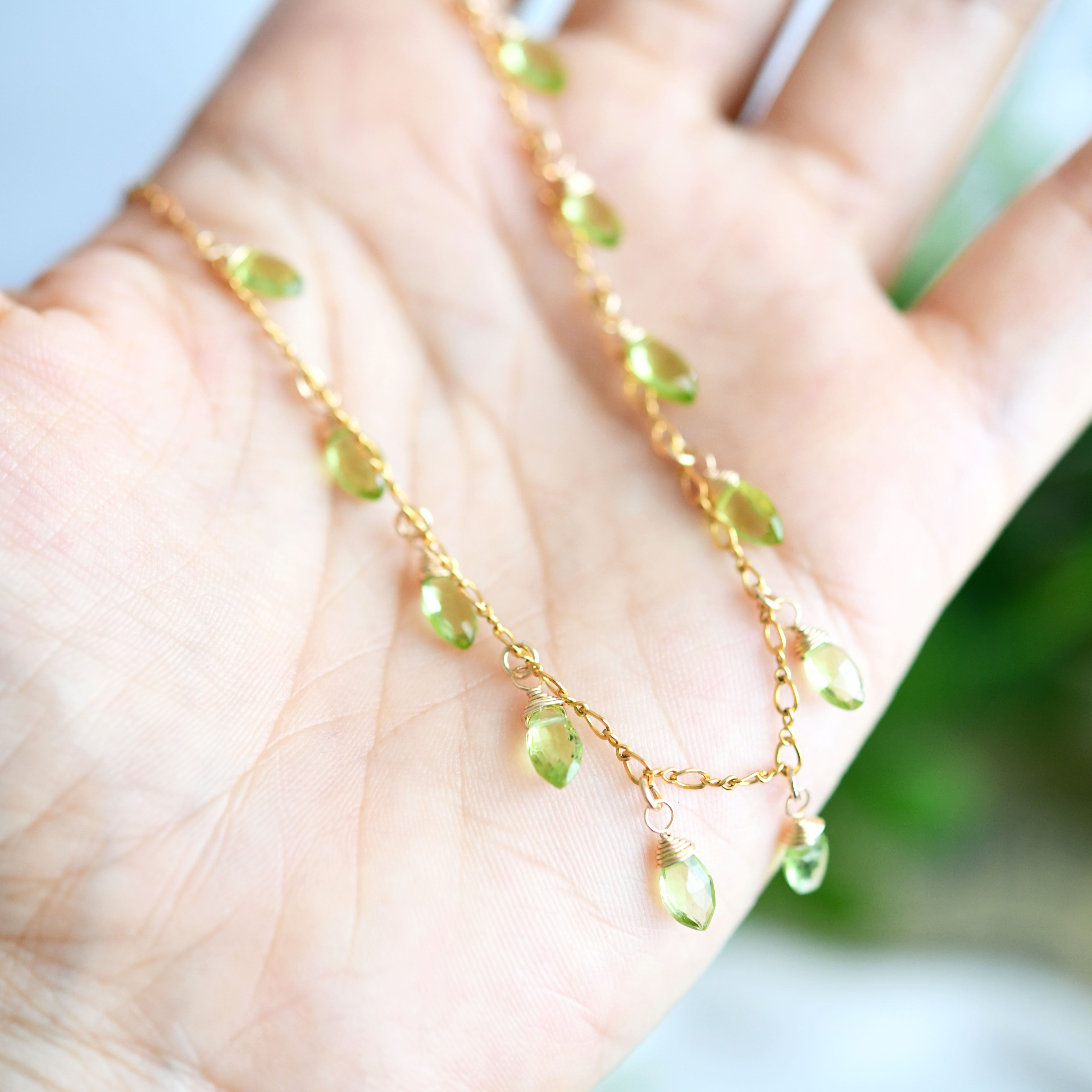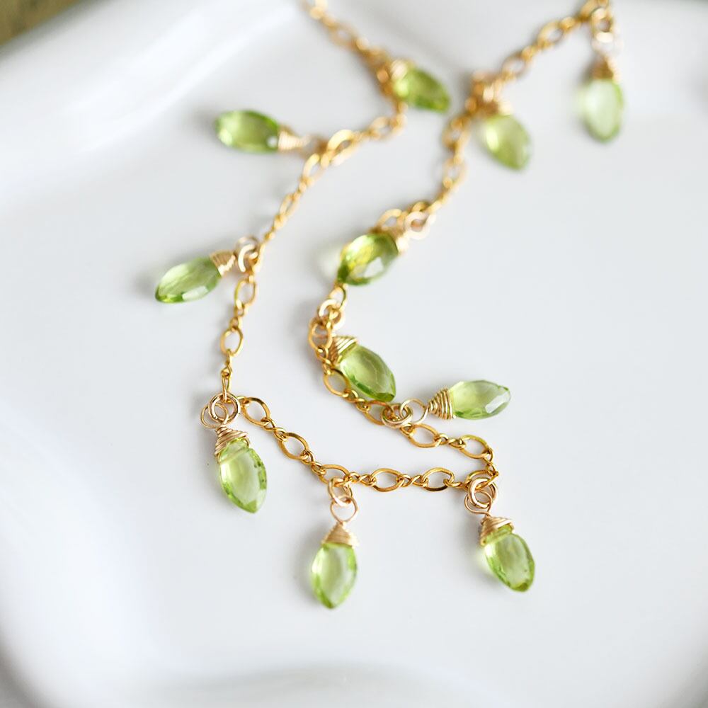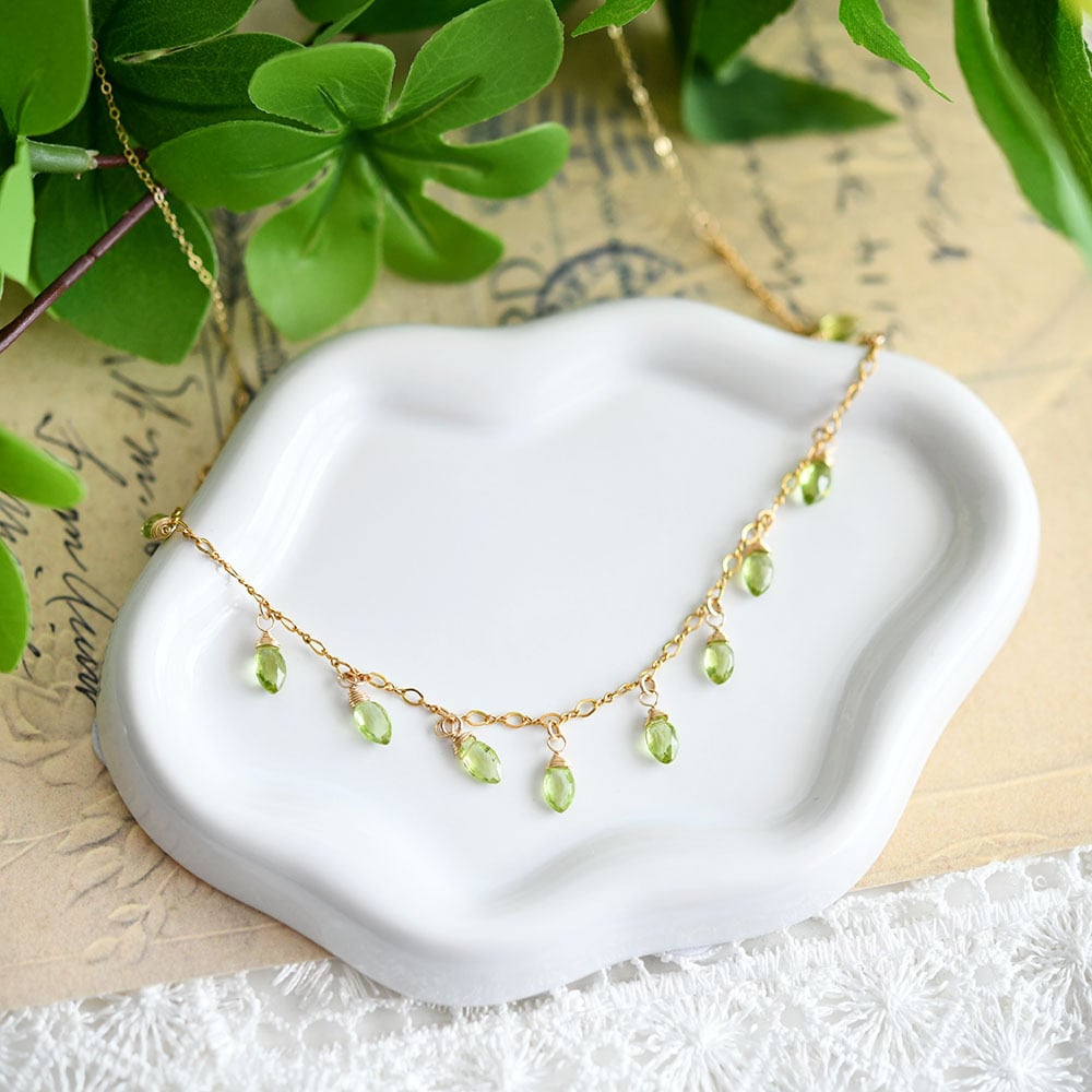 雫型のペリドットがチェーンに揺れるたび、光を受けてきらめき、首元を華やかに演出してくれます。